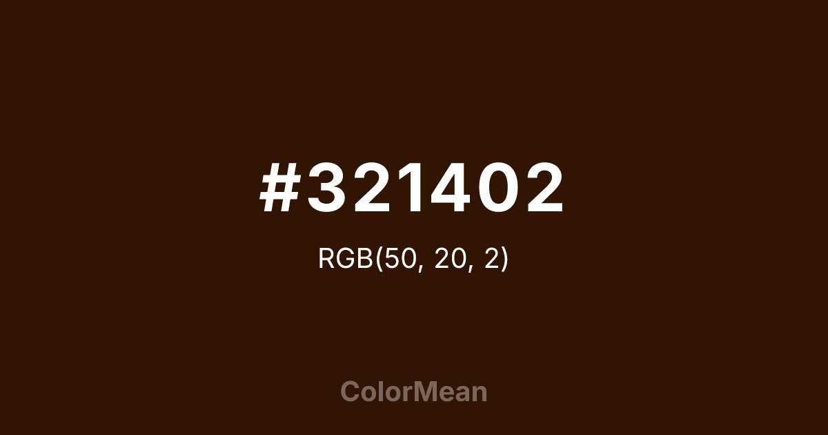 #321402 RGB value is (50, 20, 2). The hex color red value is 50, green is 20, and blue is 2. Its HSL format shows a hue of 23°, saturation of 92 percent, and lightness of 10 percent. The CMYK process values are 0 percent, 60 percent, 96 percent, 80 percent.