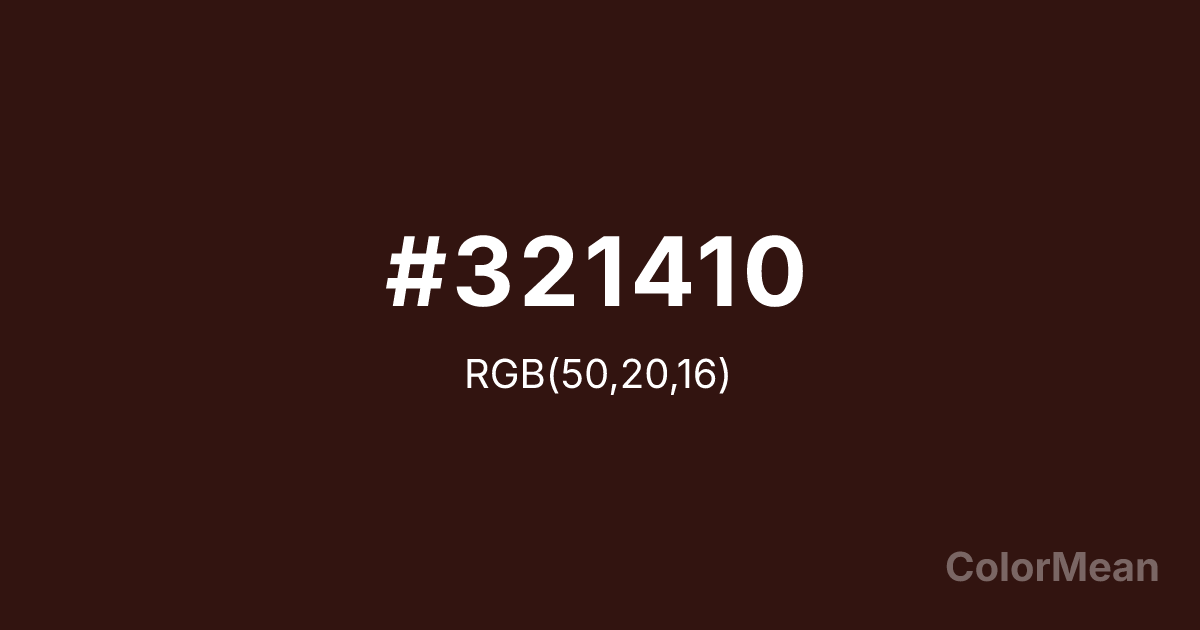 #321410 RGB value is (50, 20, 16). The hex color red value is 50, green is 20, and blue is 16. Its HSL format shows a hue of 7°, saturation of 52 percent, and lightness of 13 percent. The CMYK process values are 0 percent, 60 percent, 68 percent, 80 percent.