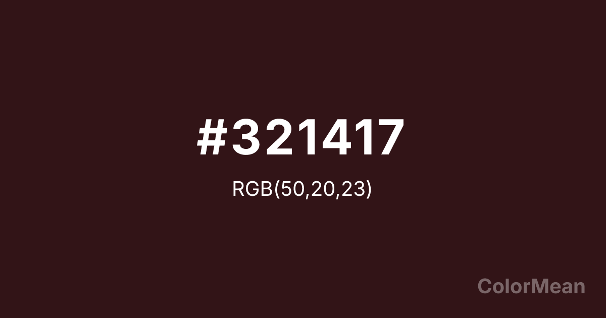 #321417 RGB value is (50, 20, 23). The hex color red value is 50, green is 20, and blue is 23. Its HSL format shows a hue of 354°, saturation of 43 percent, and lightness of 14 percent. The CMYK process values are 0 percent, 60 percent, 54 percent, 80 percent.