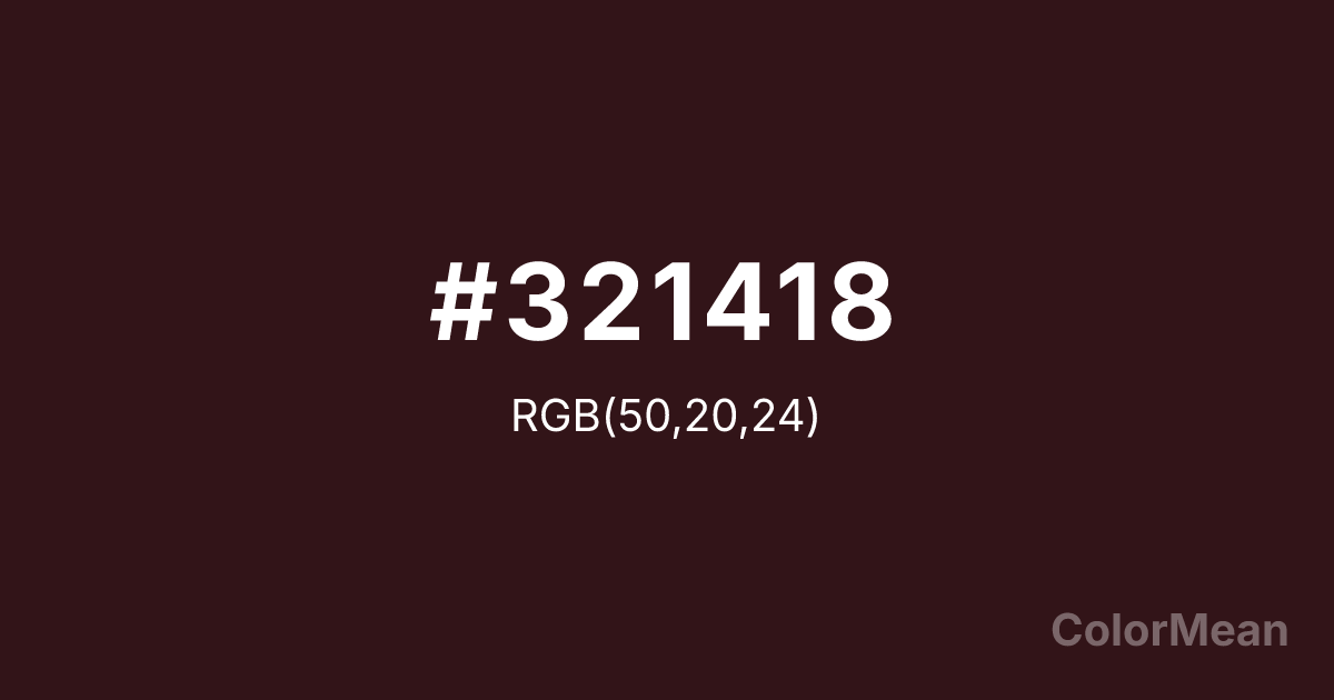 #321418 RGB value is (50, 20, 24). The hex color red value is 50, green is 20, and blue is 24. Its HSL format shows a hue of 352°, saturation of 43 percent, and lightness of 14 percent. The CMYK process values are 0 percent, 60 percent, 52 percent, 80 percent.