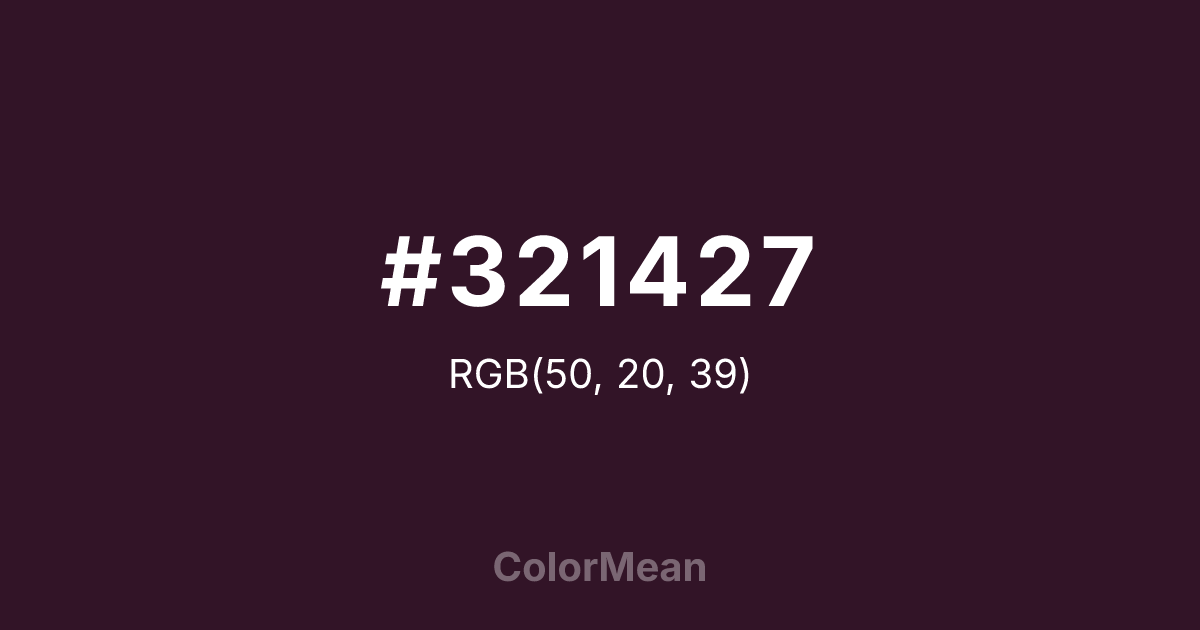 #321427 RGB value is (50, 20, 39). The hex color red value is 50, green is 20, and blue is 39. Its HSL format shows a hue of 322°, saturation of 43 percent, and lightness of 14 percent. The CMYK process values are 0 percent, 60 percent, 22 percent, 80 percent.