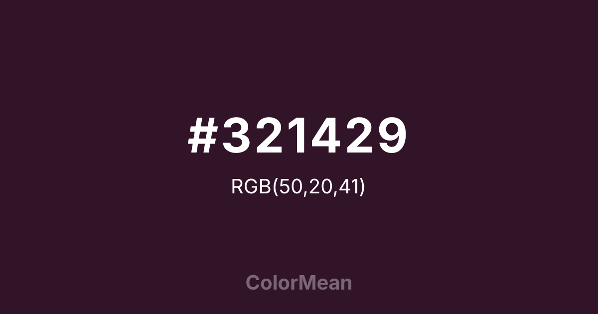 #321429 RGB value is (50, 20, 41). The hex color red value is 50, green is 20, and blue is 41. Its HSL format shows a hue of 318°, saturation of 43 percent, and lightness of 14 percent. The CMYK process values are 0 percent, 60 percent, 18 percent, 80 percent.