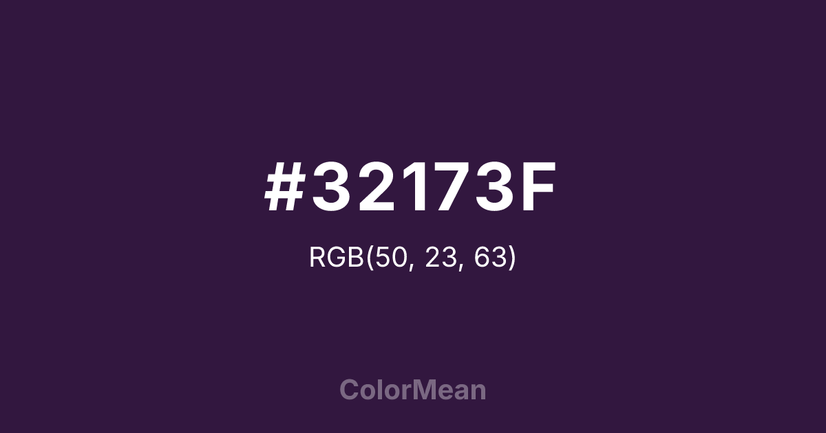 #32173F RGB value is (50, 23, 63). The hex color red value is 50, green is 23, and blue is 63. Its HSL format shows a hue of 281°, saturation of 47 percent, and lightness of 17 percent. The CMYK process values are 21 percent, 63 percent, 0 percent, 75 percent.