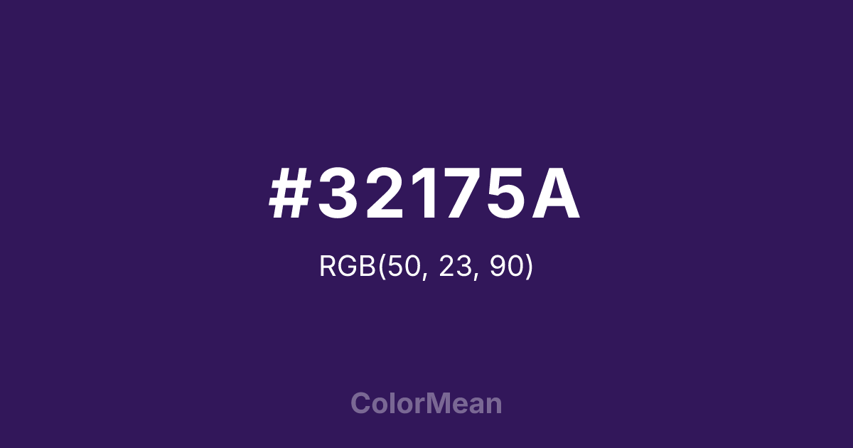 #32175A RGB value is (50, 23, 90). The hex color red value is 50, green is 23, and blue is 90. Its HSL format shows a hue of 264°, saturation of 59 percent, and lightness of 22 percent. The CMYK process values are 44 percent, 74 percent, 0 percent, 65 percent.