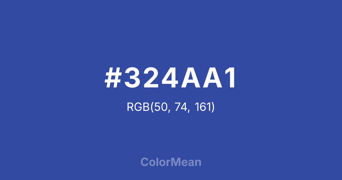 #324AA1 RGB value is (50, 74, 161). The hex color red value is 50, green is 74, and blue is 161. Its HSL format shows a hue of 227°, saturation of 53 percent, and lightness of 41 percent. The CMYK process values are 69 percent, 54 percent, 0 percent, 37 percent.