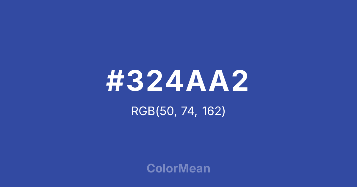 #324AA2 RGB value is (50, 74, 162). The hex color red value is 50, green is 74, and blue is 162. Its HSL format shows a hue of 227°, saturation of 53 percent, and lightness of 42 percent. The CMYK process values are 69 percent, 54 percent, 0 percent, 36 percent.