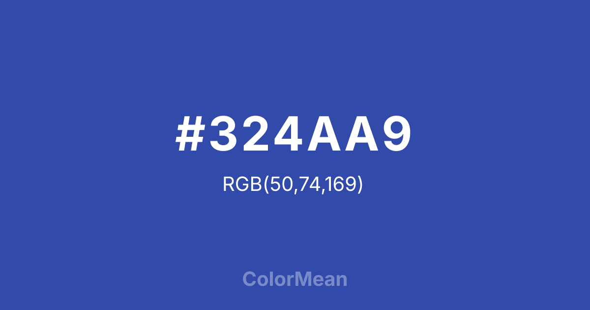 #324AA9 RGB value is (50, 74, 169). The hex color red value is 50, green is 74, and blue is 169. Its HSL format shows a hue of 228°, saturation of 54 percent, and lightness of 43 percent. The CMYK process values are 70 percent, 56 percent, 0 percent, 34 percent.