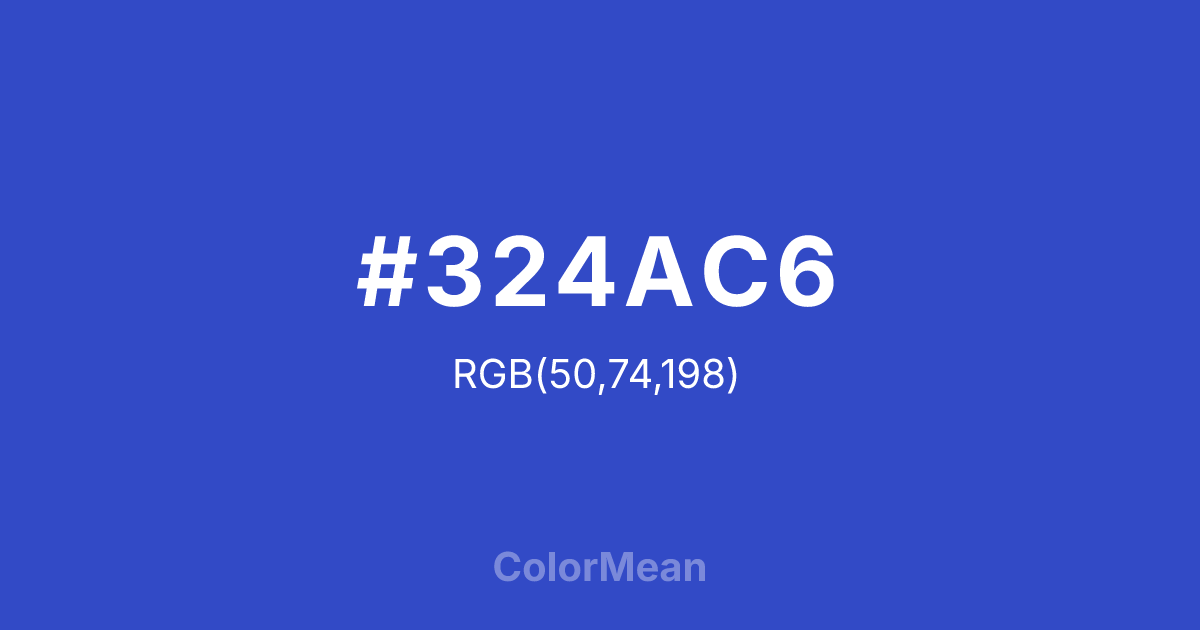 #324AC6 RGB value is (50, 74, 198). The hex color red value is 50, green is 74, and blue is 198. Its HSL format shows a hue of 230°, saturation of 60 percent, and lightness of 49 percent. The CMYK process values are 75 percent, 63 percent, 0 percent, 22 percent.