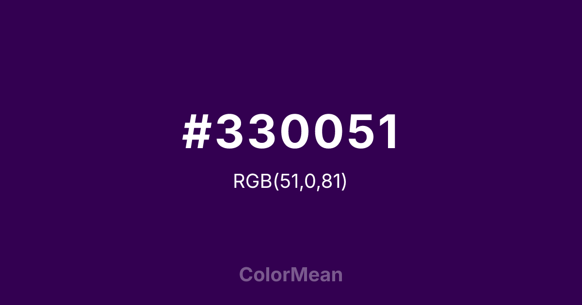 #330051 RGB value is (51, 0, 81). The hex color red value is 51, green is 0, and blue is 81. Its HSL format shows a hue of 278°, saturation of 100 percent, and lightness of 16 percent. The CMYK process values are 37 percent, 100 percent, 0 percent, 68 percent.