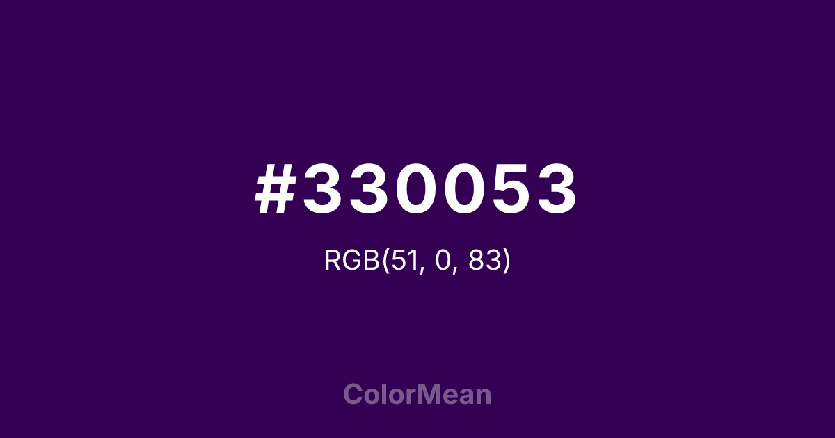 #330053 RGB value is (51, 0, 83). The hex color red value is 51, green is 0, and blue is 83. Its HSL format shows a hue of 277°, saturation of 100 percent, and lightness of 16 percent. The CMYK process values are 39 percent, 100 percent, 0 percent, 67 percent.