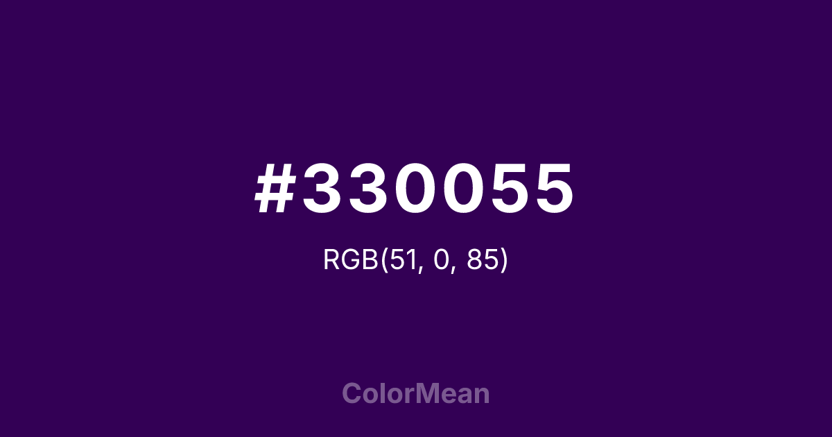 #330055 RGB value is (51, 0, 85). The hex color red value is 51, green is 0, and blue is 85. Its HSL format shows a hue of 276°, saturation of 100 percent, and lightness of 17 percent. The CMYK process values are 40 percent, 100 percent, 0 percent, 67 percent.