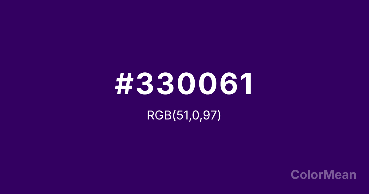 #330061 RGB value is (51, 0, 97). The hex color red value is 51, green is 0, and blue is 97. Its HSL format shows a hue of 272°, saturation of 100 percent, and lightness of 19 percent. The CMYK process values are 47 percent, 100 percent, 0 percent, 62 percent.