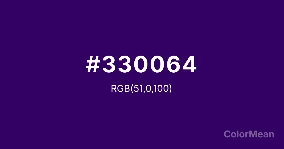 #330064 RGB value is (51, 0, 100). The hex color red value is 51, green is 0, and blue is 100. Its HSL format shows a hue of 271°, saturation of 100 percent, and lightness of 20 percent. The CMYK process values are 49 percent, 100 percent, 0 percent, 61 percent.