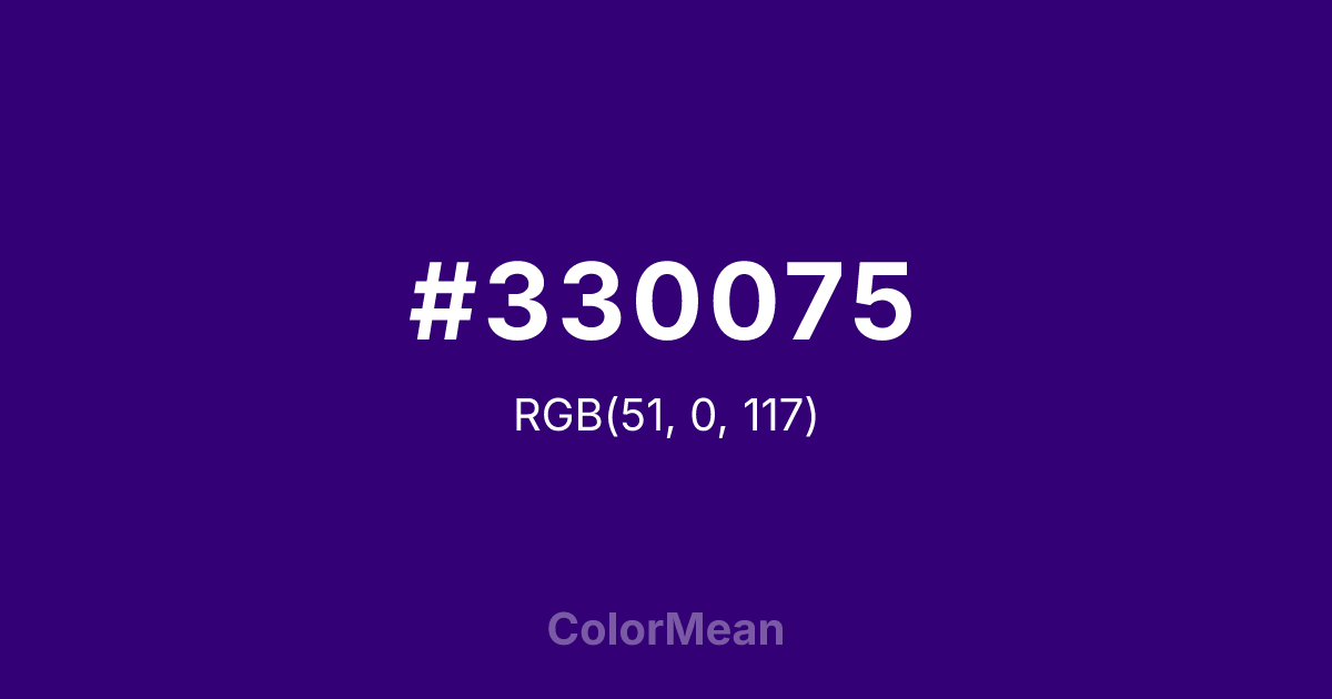 #330075 RGB value is (51, 0, 117). The hex color red value is 51, green is 0, and blue is 117. Its HSL format shows a hue of 266°, saturation of 100 percent, and lightness of 23 percent. The CMYK process values are 56 percent, 100 percent, 0 percent, 54 percent.