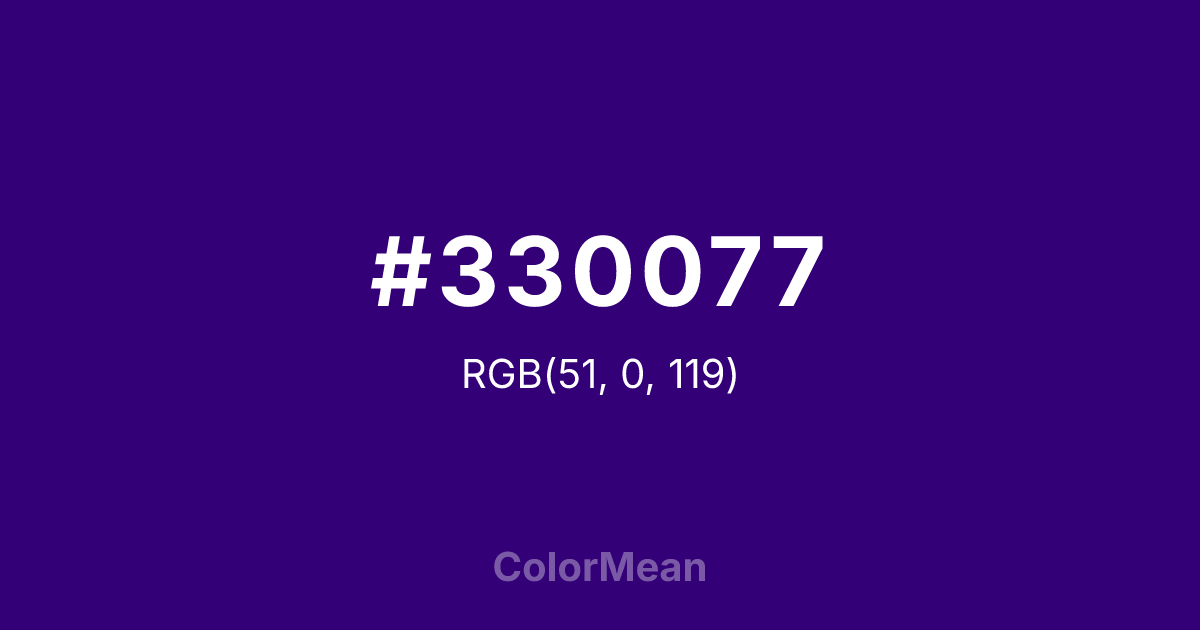 #330077 RGB value is (51, 0, 119). The hex color red value is 51, green is 0, and blue is 119. Its HSL format shows a hue of 266°, saturation of 100 percent, and lightness of 23 percent. The CMYK process values are 57 percent, 100 percent, 0 percent, 53 percent.