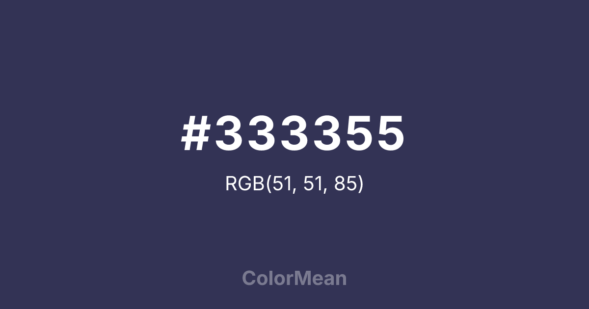#333355 RGB value is (51, 51, 85). The hex color red value is 51, green is 51, and blue is 85. Its HSL format shows a hue of 240°, saturation of 25 percent, and lightness of 27 percent. The CMYK process values are 40 percent, 40 percent, 0 percent, 67 percent.