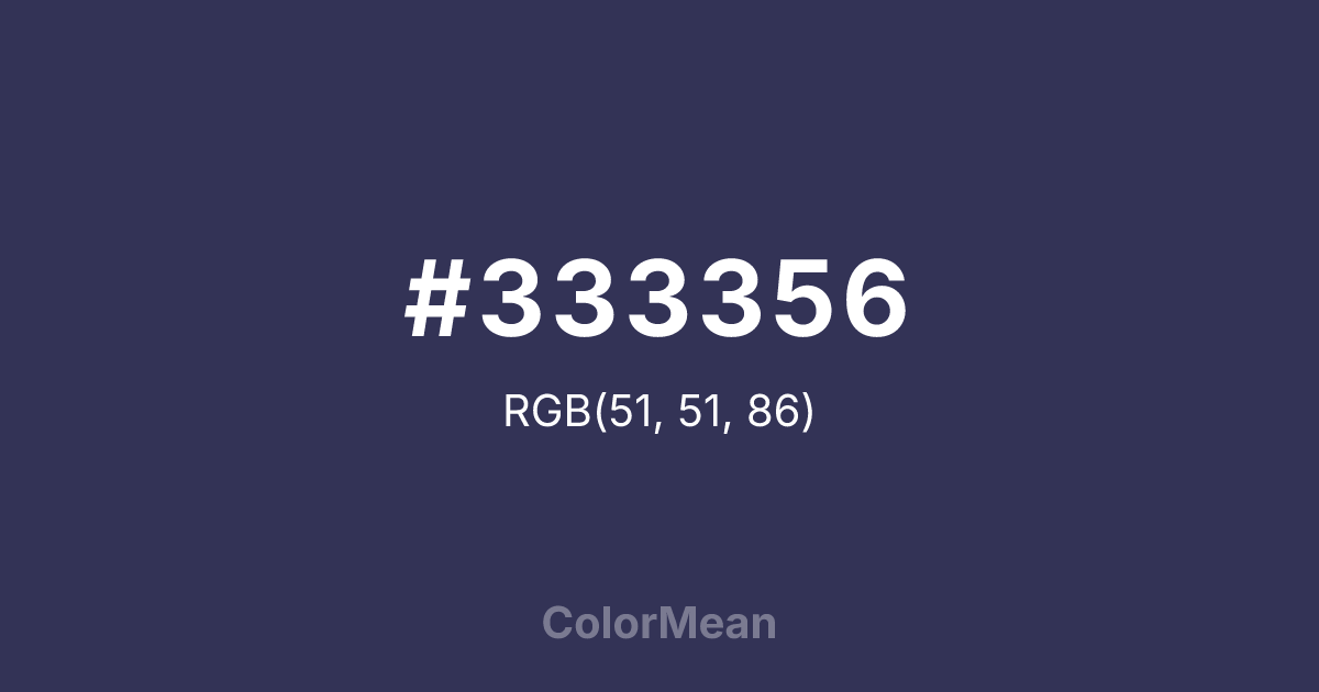 #333356 RGB value is (51, 51, 86). The hex color red value is 51, green is 51, and blue is 86. Its HSL format shows a hue of 240°, saturation of 26 percent, and lightness of 27 percent. The CMYK process values are 41 percent, 41 percent, 0 percent, 66 percent.