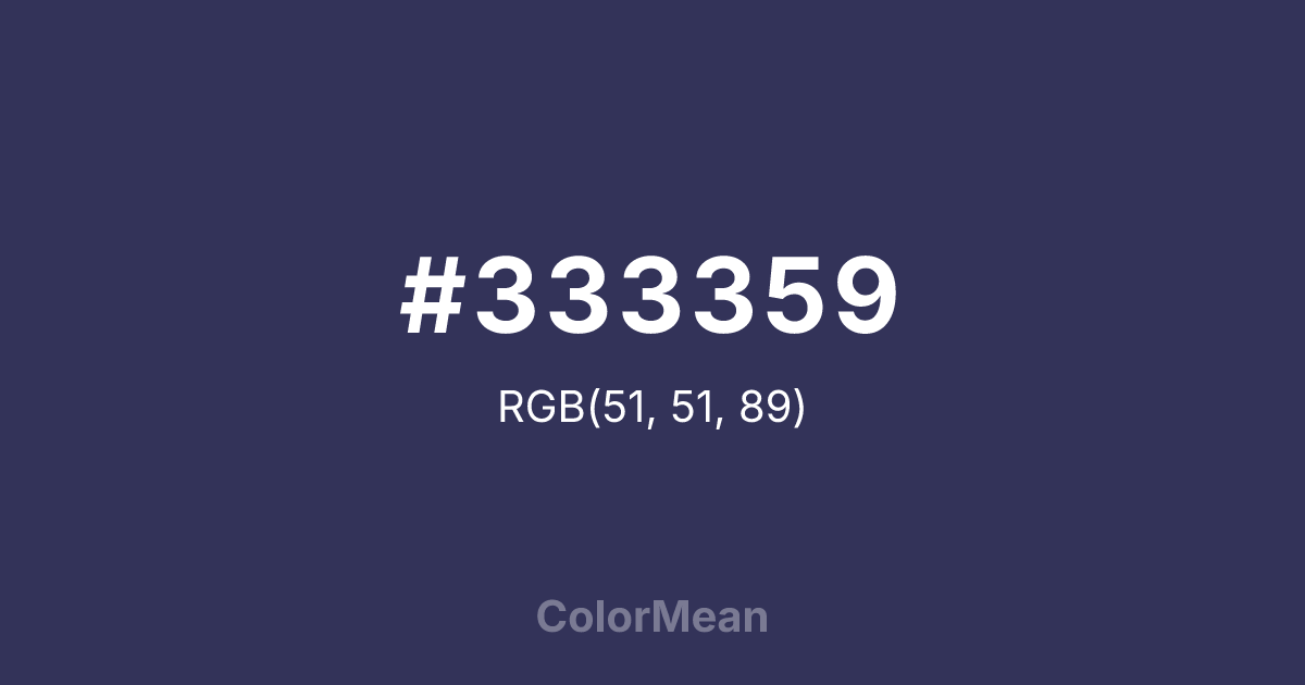 #333359 RGB value is (51, 51, 89). The hex color red value is 51, green is 51, and blue is 89. Its HSL format shows a hue of 240°, saturation of 27 percent, and lightness of 27 percent. The CMYK process values are 43 percent, 43 percent, 0 percent, 65 percent.
