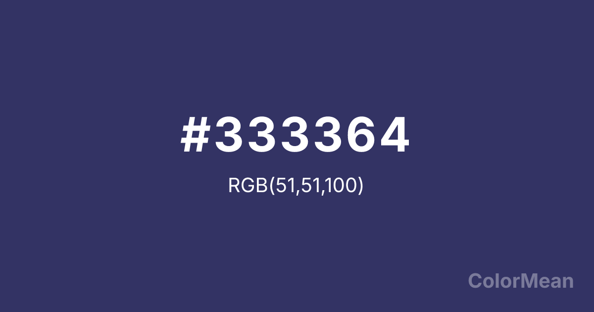 #333364 RGB value is (51, 51, 100). The hex color red value is 51, green is 51, and blue is 100. Its HSL format shows a hue of 240°, saturation of 32 percent, and lightness of 30 percent. The CMYK process values are 49 percent, 49 percent, 0 percent, 61 percent.
