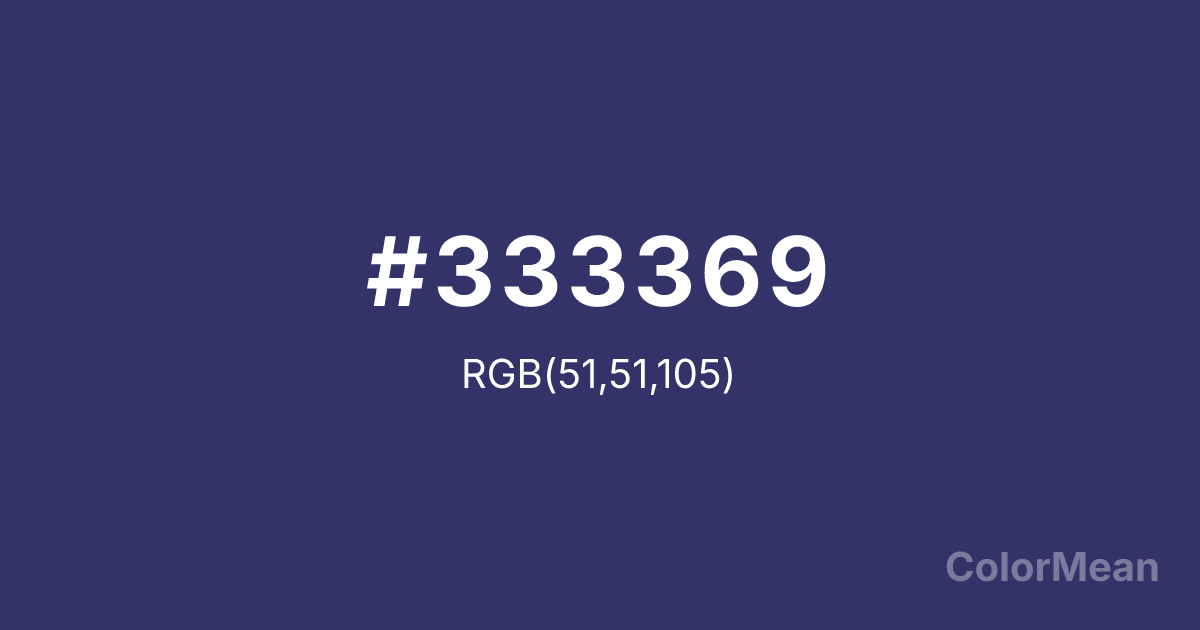 #333369 RGB value is (51, 51, 105). The hex color red value is 51, green is 51, and blue is 105. Its HSL format shows a hue of 240°, saturation of 35 percent, and lightness of 31 percent. The CMYK process values are 51 percent, 51 percent, 0 percent, 59 percent.