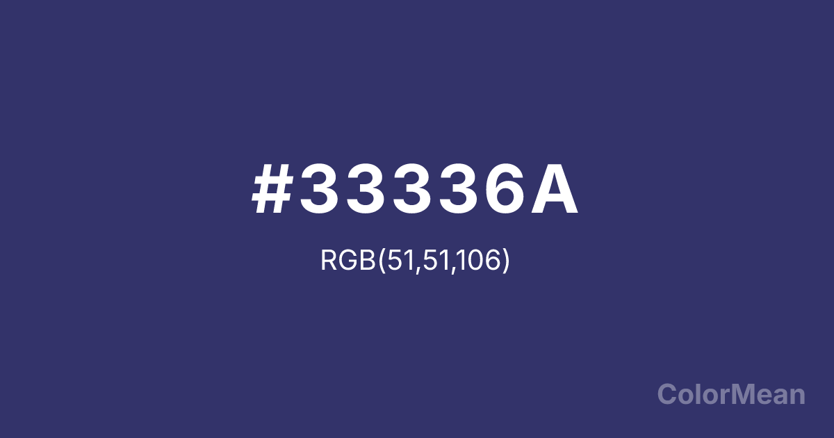 #33336A RGB value is (51, 51, 106). The hex color red value is 51, green is 51, and blue is 106. Its HSL format shows a hue of 240°, saturation of 35 percent, and lightness of 31 percent. The CMYK process values are 52 percent, 52 percent, 0 percent, 58 percent.