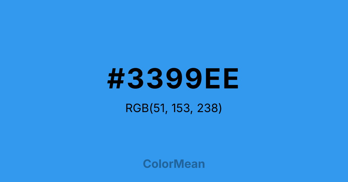 #3399EE RGB value is (51, 153, 238). The hex color red value is 51, green is 153, and blue is 238. Its HSL format shows a hue of 207°, saturation of 85 percent, and lightness of 57 percent. The CMYK process values are 79 percent, 36 percent, 0 percent, 7 percent.