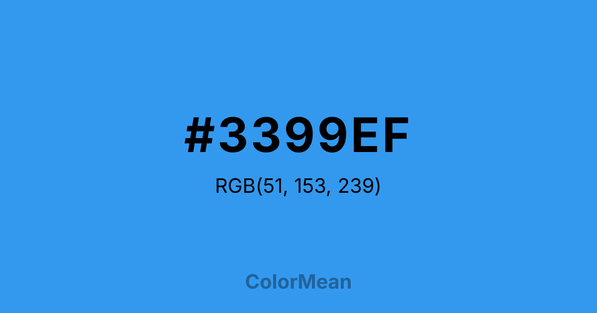 #3399EF RGB value is (51, 153, 239). The hex color red value is 51, green is 153, and blue is 239. Its HSL format shows a hue of 207°, saturation of 85 percent, and lightness of 57 percent. The CMYK process values are 79 percent, 36 percent, 0 percent, 6 percent.