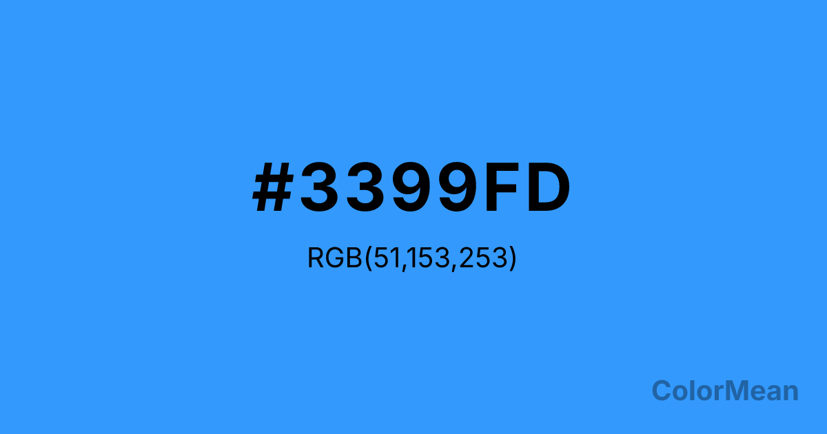 #3399FD RGB value is (51, 153, 253). The hex color red value is 51, green is 153, and blue is 253. Its HSL format shows a hue of 210°, saturation of 98 percent, and lightness of 60 percent. The CMYK process values are 80 percent, 40 percent, 0 percent, 1 percent.
