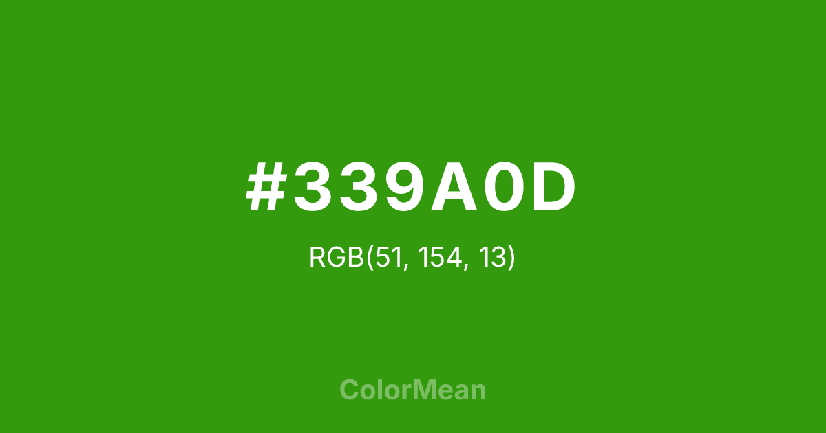 #339A0D RGB value is (51, 154, 13). The hex color red value is 51, green is 154, and blue is 13. Its HSL format shows a hue of 104°, saturation of 84 percent, and lightness of 33 percent. The CMYK process values are 67 percent, 0 percent, 92 percent, 40 percent.