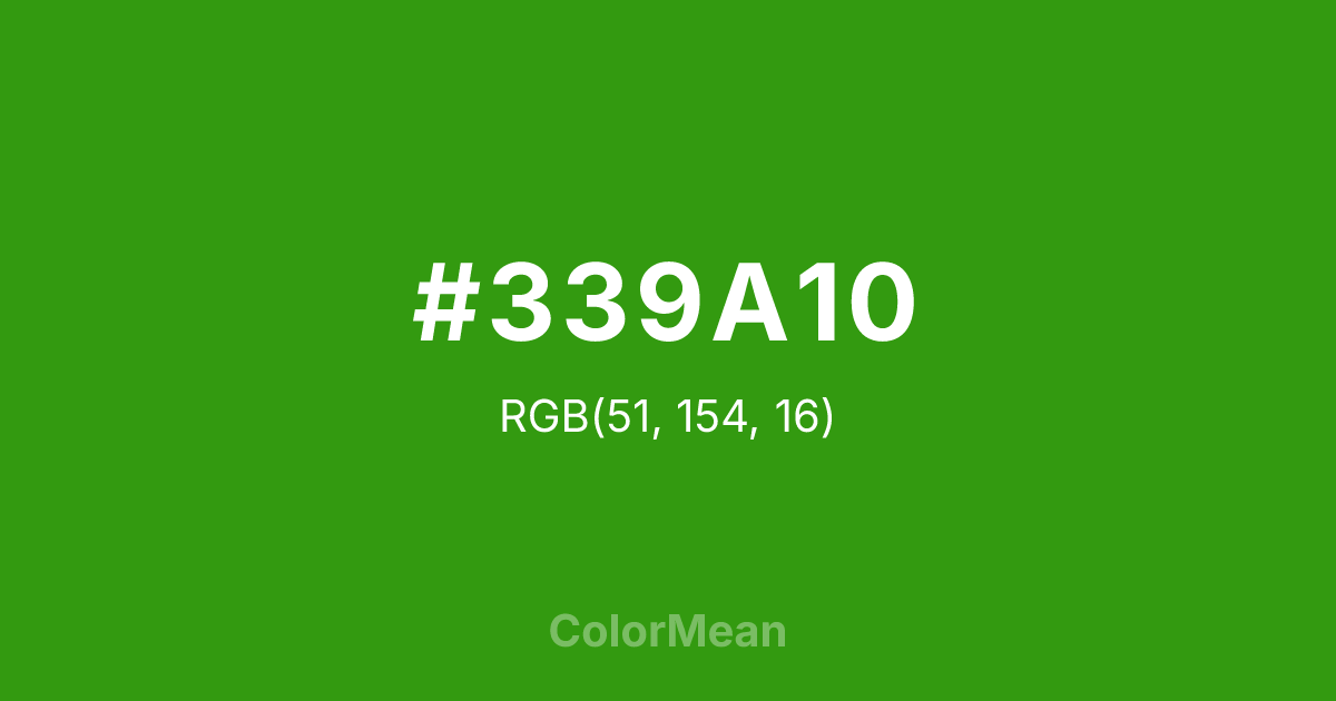 #339A10 RGB value is (51, 154, 16). The hex color red value is 51, green is 154, and blue is 16. Its HSL format shows a hue of 105°, saturation of 81 percent, and lightness of 33 percent. The CMYK process values are 67 percent, 0 percent, 90 percent, 40 percent.