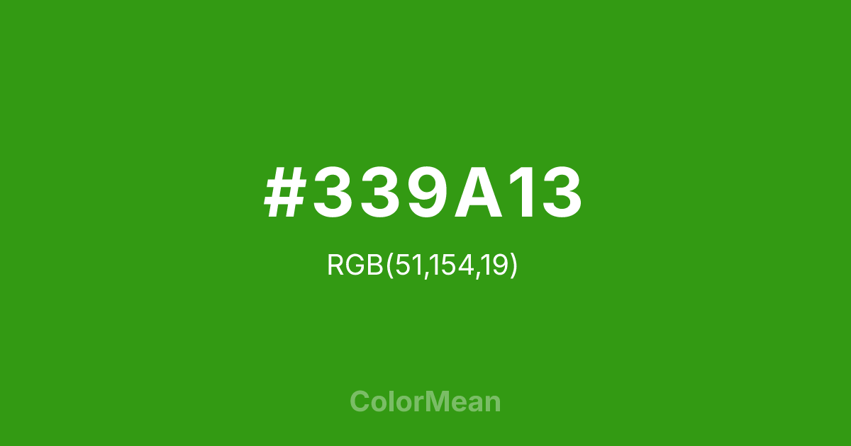 #339A13 RGB value is (51, 154, 19). The hex color red value is 51, green is 154, and blue is 19. Its HSL format shows a hue of 106°, saturation of 78 percent, and lightness of 34 percent. The CMYK process values are 67 percent, 0 percent, 88 percent, 40 percent.