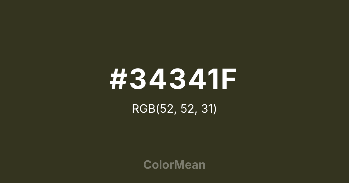 #34341F RGB value is (52, 52, 31). The hex color red value is 52, green is 52, and blue is 31. Its HSL format shows a hue of 60°, saturation of 25 percent, and lightness of 16 percent. The CMYK process values are 0 percent, 0 percent, 40 percent, 80 percent.