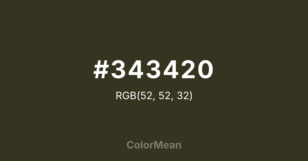 #343420 RGB value is (52, 52, 32). The hex color red value is 52, green is 52, and blue is 32. Its HSL format shows a hue of 60°, saturation of 24 percent, and lightness of 16 percent. The CMYK process values are 0 percent, 0 percent, 38 percent, 80 percent.