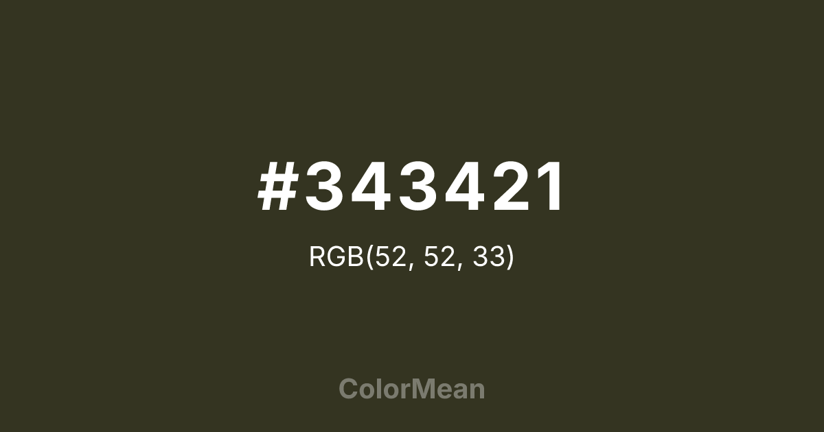 #343421 RGB value is (52, 52, 33). The hex color red value is 52, green is 52, and blue is 33. Its HSL format shows a hue of 60°, saturation of 22 percent, and lightness of 17 percent. The CMYK process values are 0 percent, 0 percent, 37 percent, 80 percent.