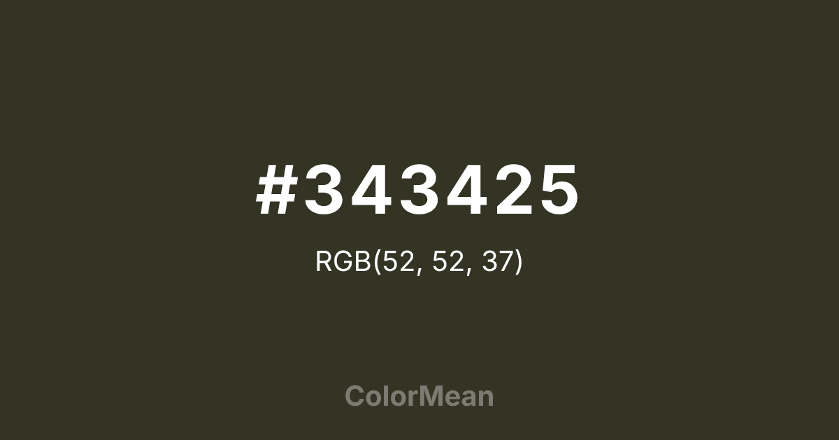 #343425 RGB value is (52, 52, 37). The hex color red value is 52, green is 52, and blue is 37. Its HSL format shows a hue of 60°, saturation of 17 percent, and lightness of 17 percent. The CMYK process values are 0 percent, 0 percent, 29 percent, 80 percent.