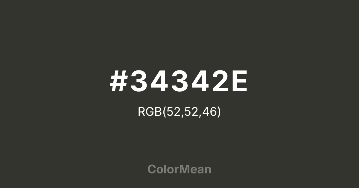 #34342E RGB value is (52, 52, 46). The hex color red value is 52, green is 52, and blue is 46. Its HSL format shows a hue of 60°, saturation of 6 percent, and lightness of 19 percent. The CMYK process values are 0 percent, 0 percent, 12 percent, 80 percent.