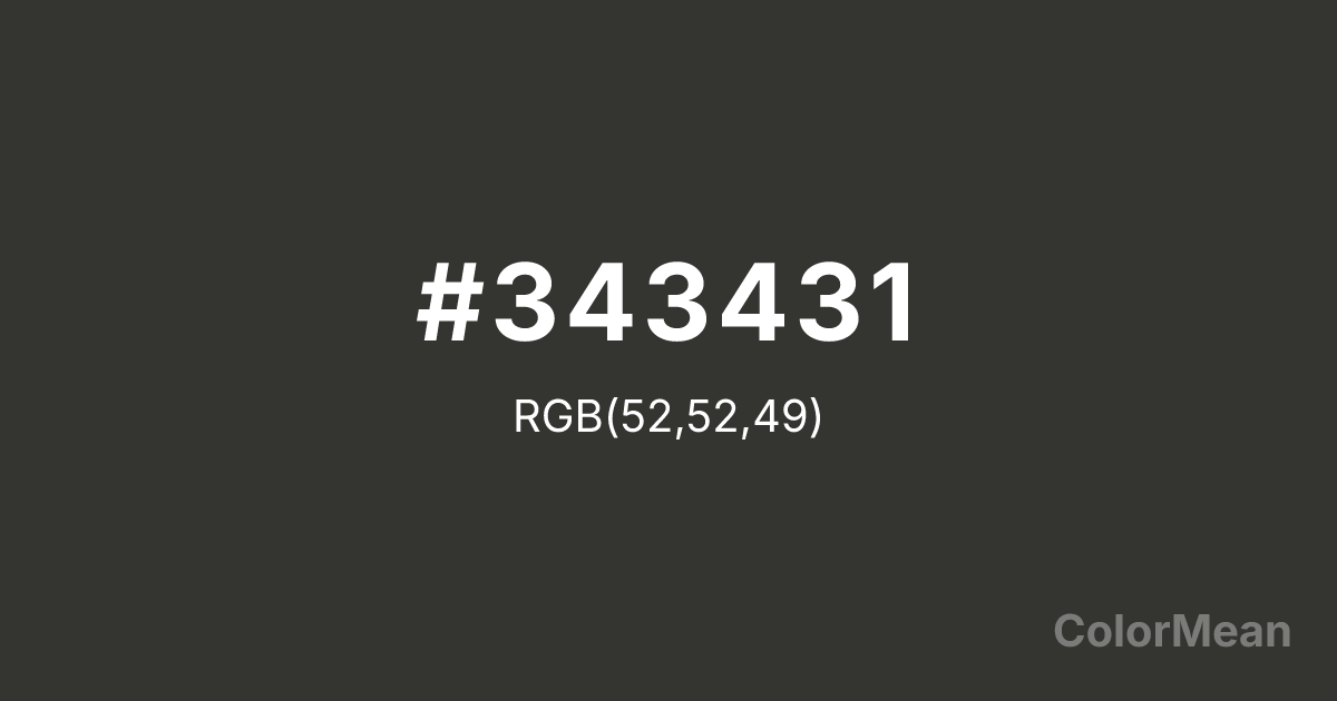 #343431 RGB value is (52, 52, 49). The hex color red value is 52, green is 52, and blue is 49. Its HSL format shows a hue of 60°, saturation of 3 percent, and lightness of 20 percent. The CMYK process values are 0 percent, 0 percent, 6 percent, 80 percent.