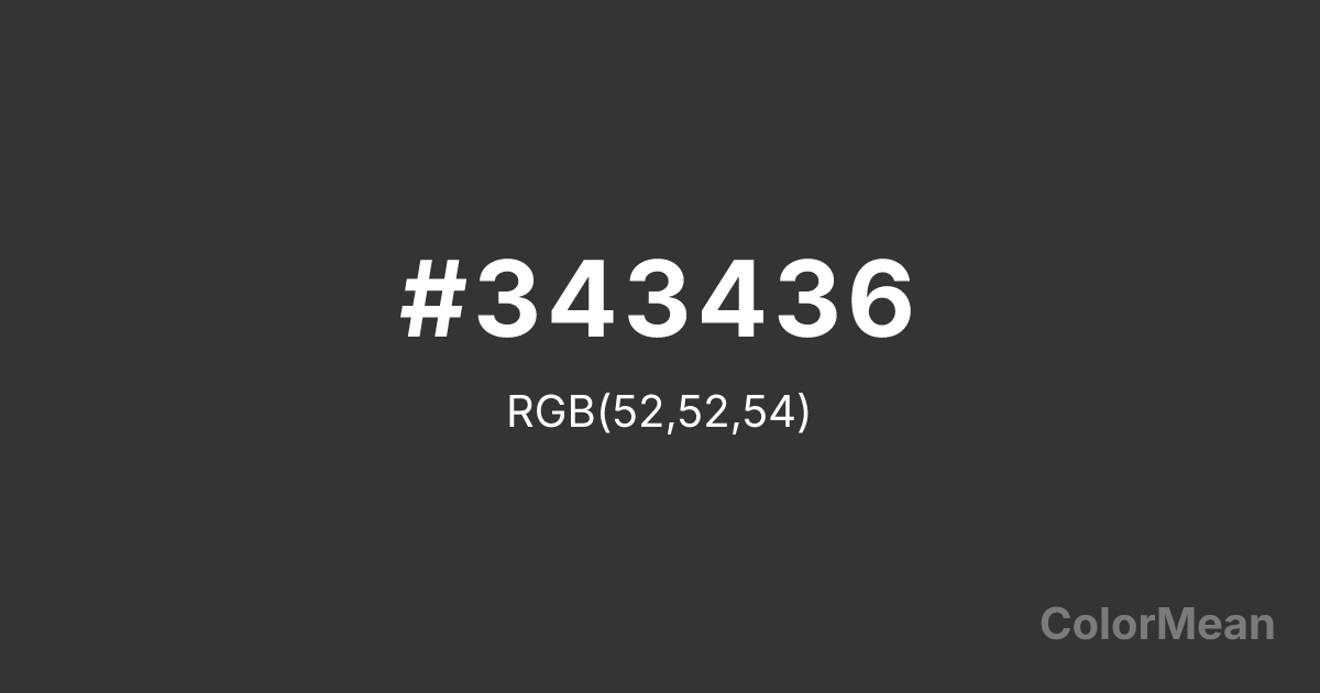 #343436 RGB value is (52, 52, 54). The hex color red value is 52, green is 52, and blue is 54. Its HSL format shows a hue of 240°, saturation of 2 percent, and lightness of 21 percent. The CMYK process values are 4 percent, 4 percent, 0 percent, 79 percent.