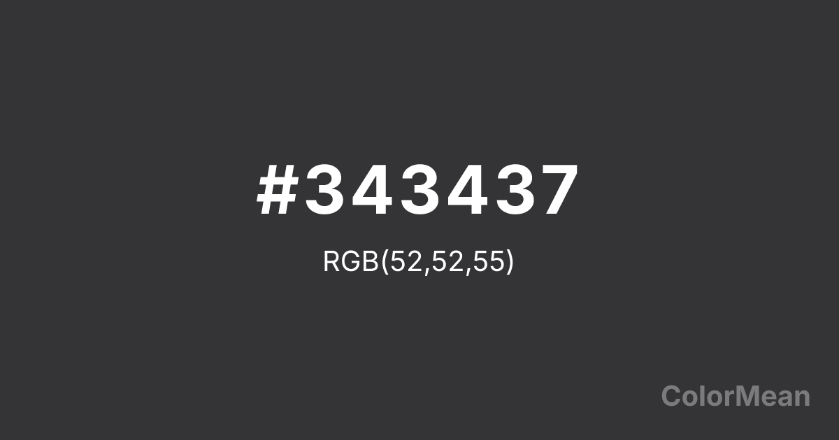 #343437 RGB value is (52, 52, 55). The hex color red value is 52, green is 52, and blue is 55. Its HSL format shows a hue of 240°, saturation of 3 percent, and lightness of 21 percent. The CMYK process values are 5 percent, 5 percent, 0 percent, 78 percent.