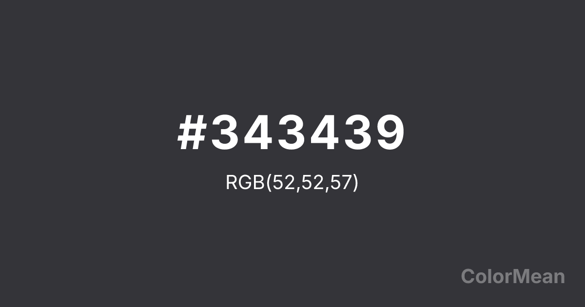 #343439 RGB value is (52, 52, 57). The hex color red value is 52, green is 52, and blue is 57. Its HSL format shows a hue of 240°, saturation of 5 percent, and lightness of 21 percent. The CMYK process values are 9 percent, 9 percent, 0 percent, 78 percent.