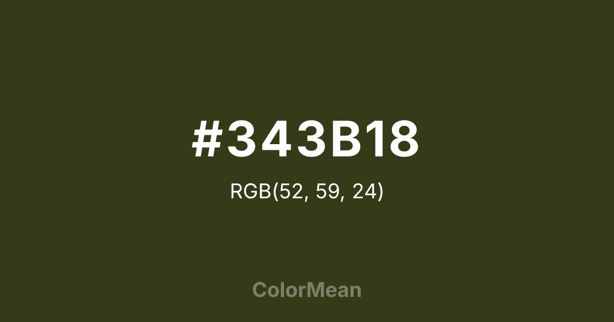 #343B18 RGB value is (52, 59, 24). The hex color red value is 52, green is 59, and blue is 24. Its HSL format shows a hue of 72°, saturation of 42 percent, and lightness of 16 percent. The CMYK process values are 12 percent, 0 percent, 59 percent, 77 percent.