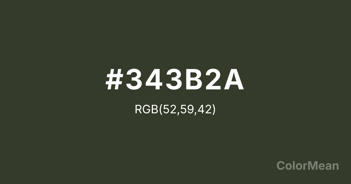 #343B2A RGB value is (52, 59, 42). The hex color red value is 52, green is 59, and blue is 42. Its HSL format shows a hue of 85°, saturation of 17 percent, and lightness of 20 percent. The CMYK process values are 12 percent, 0 percent, 29 percent, 77 percent.