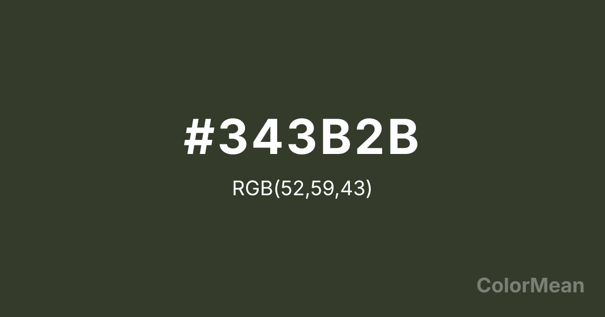 #343B2B RGB value is (52, 59, 43). The hex color red value is 52, green is 59, and blue is 43. Its HSL format shows a hue of 86°, saturation of 16 percent, and lightness of 20 percent. The CMYK process values are 12 percent, 0 percent, 27 percent, 77 percent.