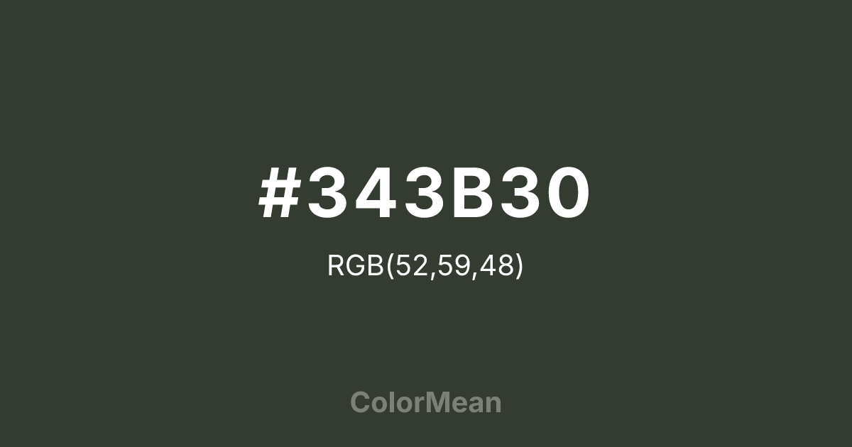 #343B30 RGB value is (52, 59, 48). The hex color red value is 52, green is 59, and blue is 48. Its HSL format shows a hue of 98°, saturation of 10 percent, and lightness of 21 percent. The CMYK process values are 12 percent, 0 percent, 19 percent, 77 percent.