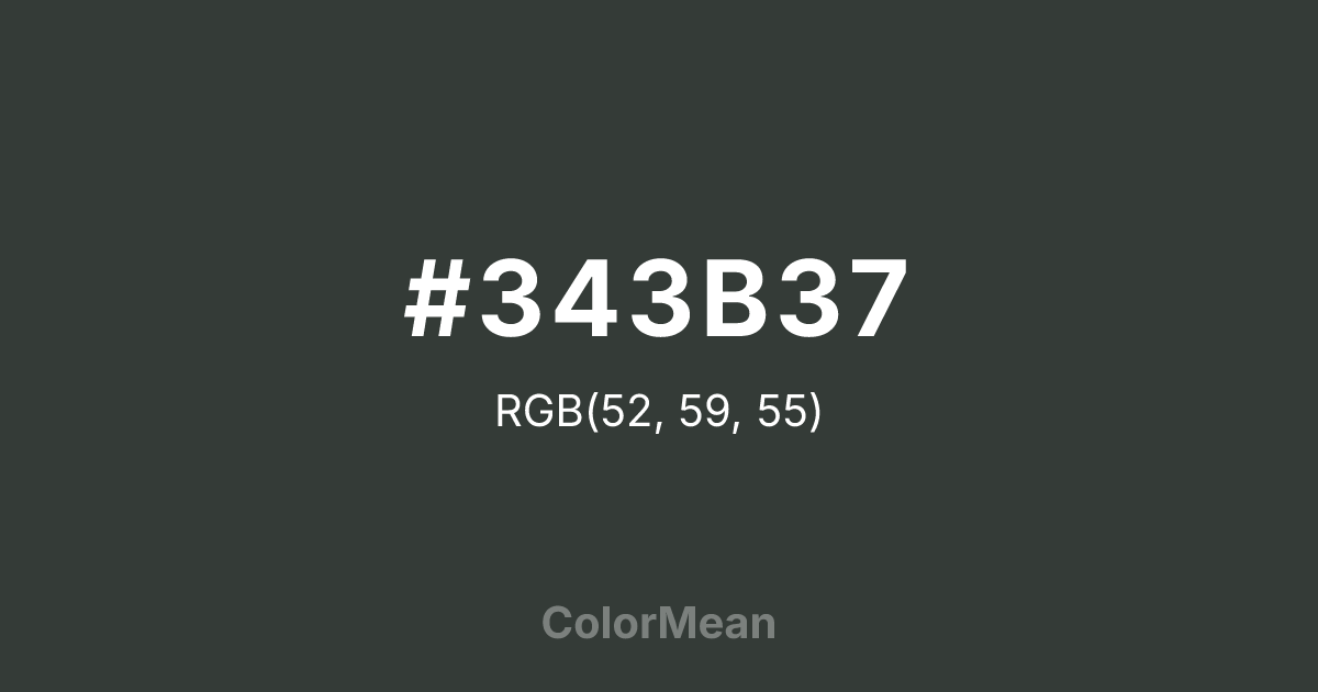 #343B37 RGB value is (52, 59, 55). The hex color red value is 52, green is 59, and blue is 55. Its HSL format shows a hue of 146°, saturation of 6 percent, and lightness of 22 percent. The CMYK process values are 12 percent, 0 percent, 7 percent, 77 percent.