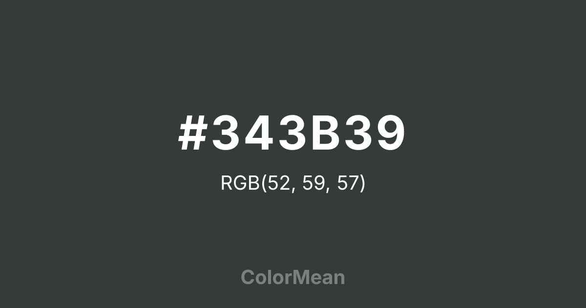 #343B39 RGB value is (52, 59, 57). The hex color red value is 52, green is 59, and blue is 57. Its HSL format shows a hue of 163°, saturation of 6 percent, and lightness of 22 percent. The CMYK process values are 12 percent, 0 percent, 3 percent, 77 percent.
