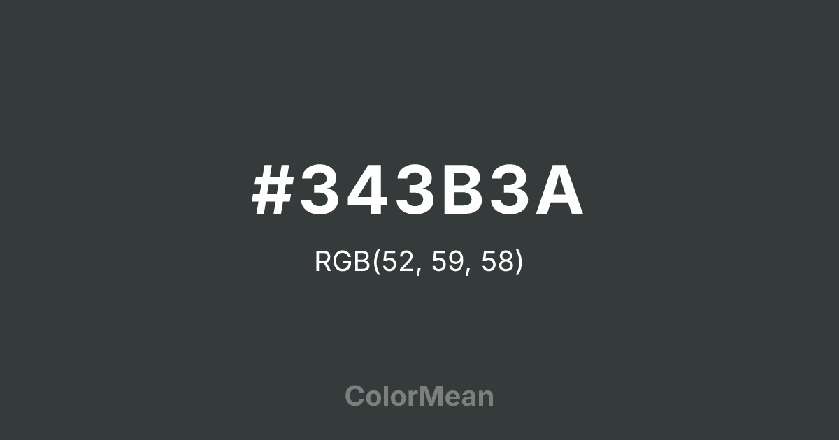 #343B3A RGB value is (52, 59, 58). The hex color red value is 52, green is 59, and blue is 58. Its HSL format shows a hue of 171°, saturation of 6 percent, and lightness of 22 percent. The CMYK process values are 12 percent, 0 percent, 2 percent, 77 percent.