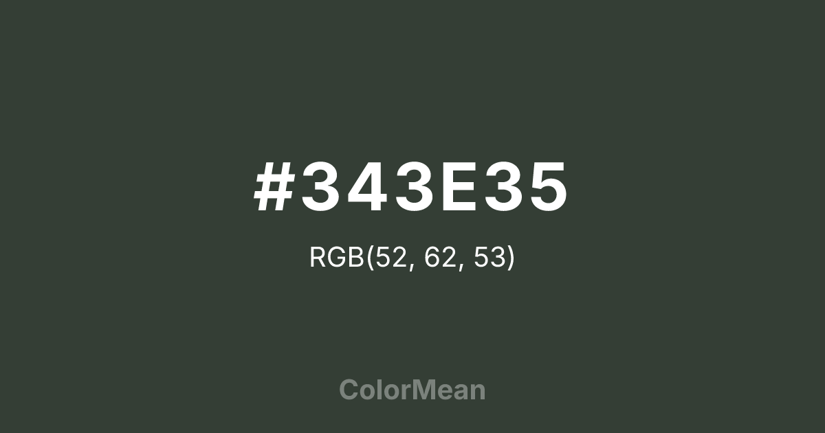 #343E35 RGB value is (52, 62, 53). The hex color red value is 52, green is 62, and blue is 53. Its HSL format shows a hue of 126°, saturation of 9 percent, and lightness of 22 percent. The CMYK process values are 16 percent, 0 percent, 15 percent, 76 percent.