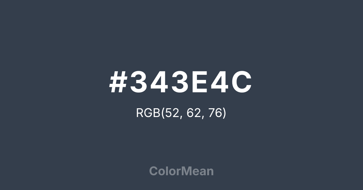 #343E4C RGB value is (52, 62, 76). The hex color red value is 52, green is 62, and blue is 76. Its HSL format shows a hue of 215°, saturation of 19 percent, and lightness of 25 percent. The CMYK process values are 32 percent, 18 percent, 0 percent, 70 percent.