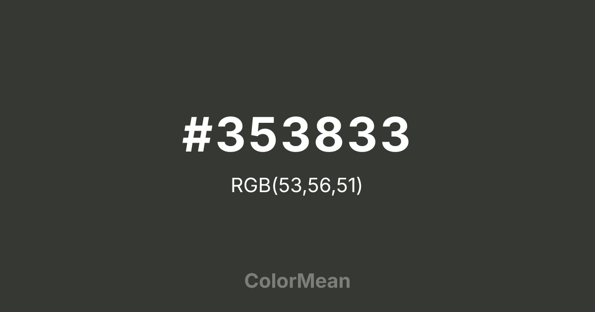 #353833 RGB value is (53, 56, 51). The hex color red value is 53, green is 56, and blue is 51. Its HSL format shows a hue of 96°, saturation of 5 percent, and lightness of 21 percent. The CMYK process values are 5 percent, 0 percent, 9 percent, 78 percent.